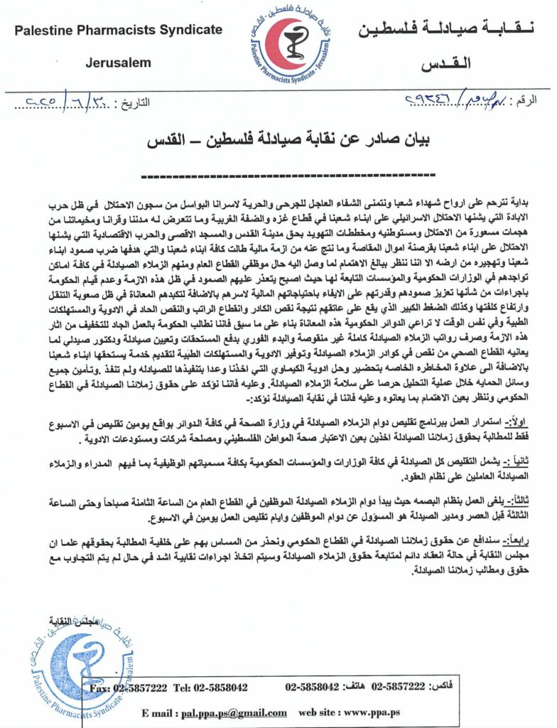 خبر صادر عن مجلس نقابة صيادلة فلسطين