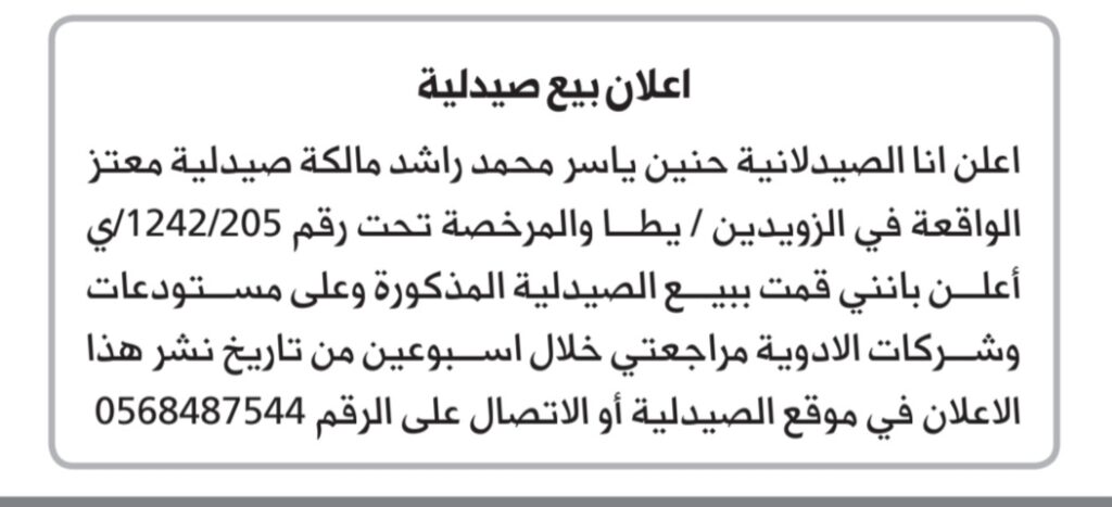 Post navigation اعلان بيع صيدلية الحرية / وادي الهرية – الخليل اعلان بيع حصة من صيدلية بست فارم 2 / كفر عقب