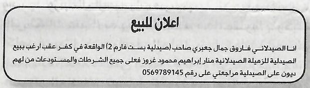 اعلان بيع صيدلية الحرية / وادي الهرية – الخليل