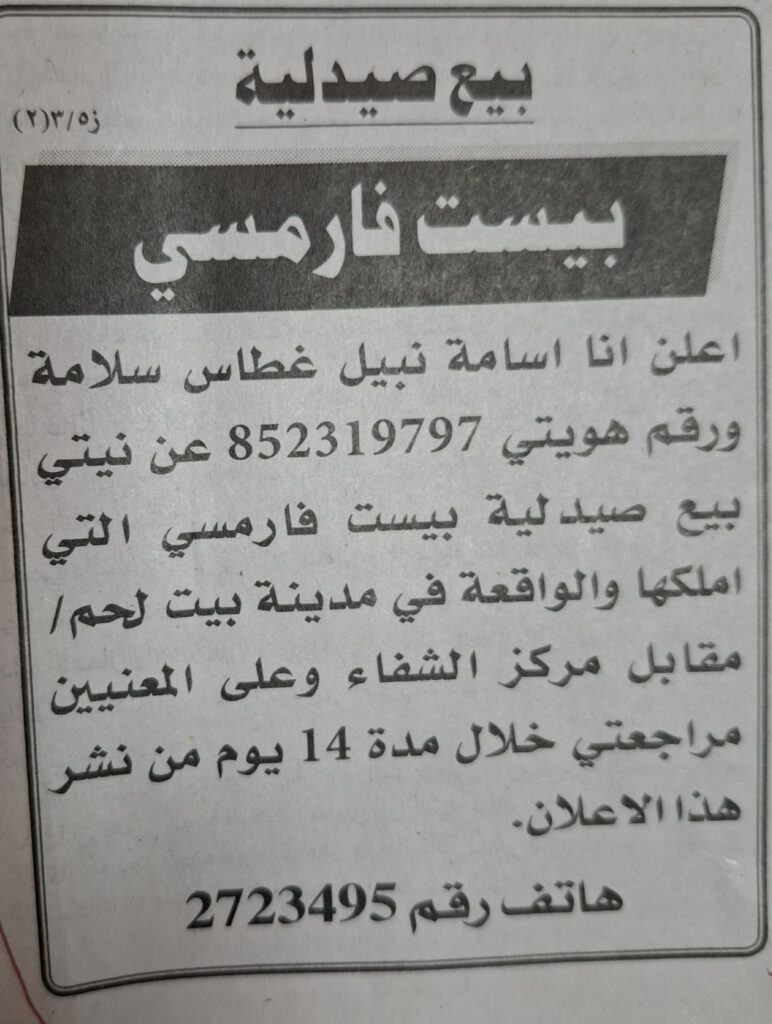 اعلان بيع صيدلية بيست فارمسي / بيت لحم