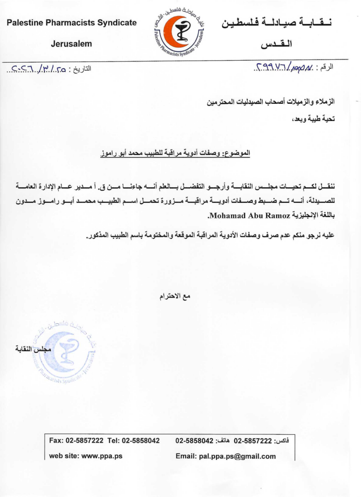 بيان صادر عن مجلس نقابة صيادلة فلسطين