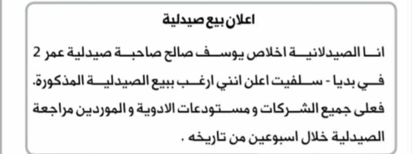 - إعلان بيع صيدلية الأسرة