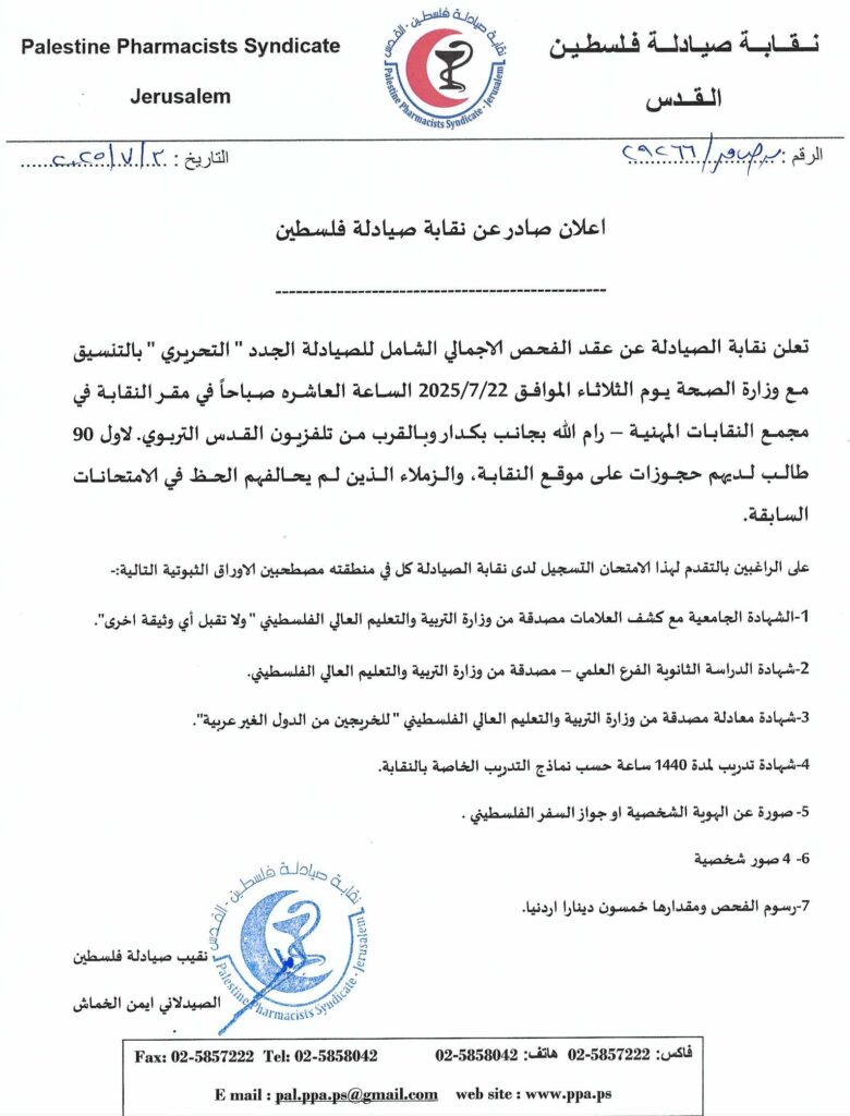 - اعلان عن موعد عقد الفحص الاجمالي الشامل للصيادلة الجدد