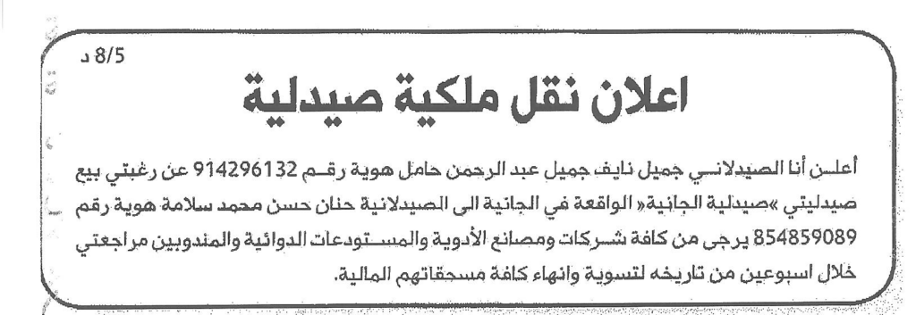 - اعلان بيع حصة من صيدلية بلسم الجديدة