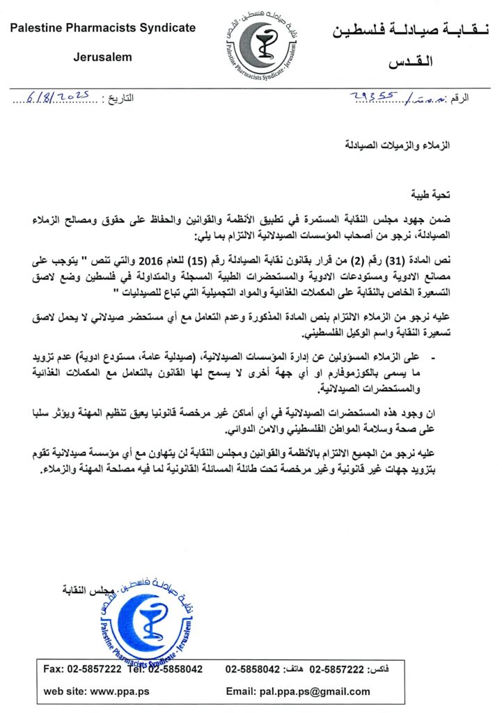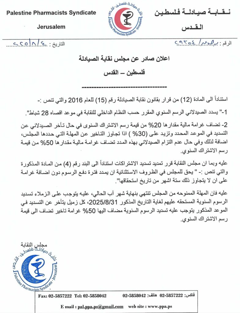 - دعوة لحضور اجتماع الهيئة العامة العادي السنوي لنقابة صيادلة فلسطين