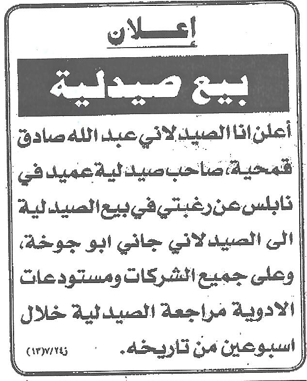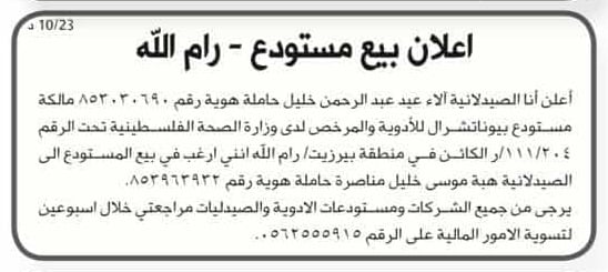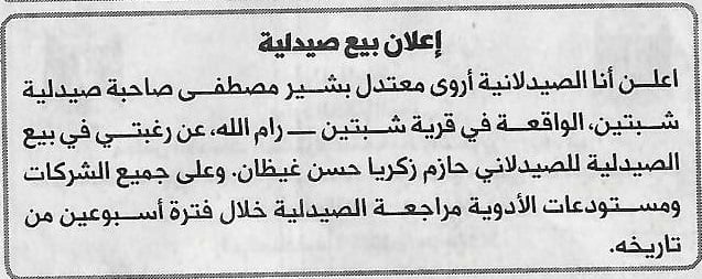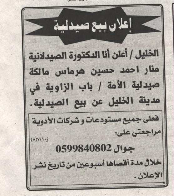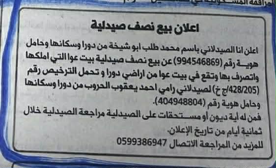 - اعلان بيع صيدلية ابو الفيلات / الخليل
