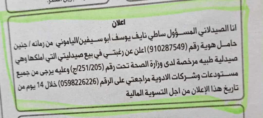 - إعلان بيع صيدلية أبو سيفين /جنين