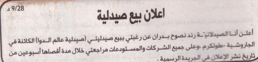 - اعلان بيع صيدلية دار الدواء/نابلس
