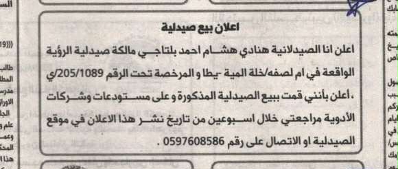 - اعلان بيع صيدلية الرؤية/الخليل