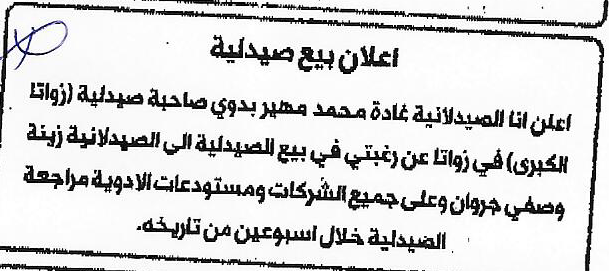 - اعلان بيع صيدلية معتز/زويدين
