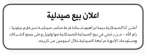 - اعلان بيع صيدلية الشواورة بيت لحم