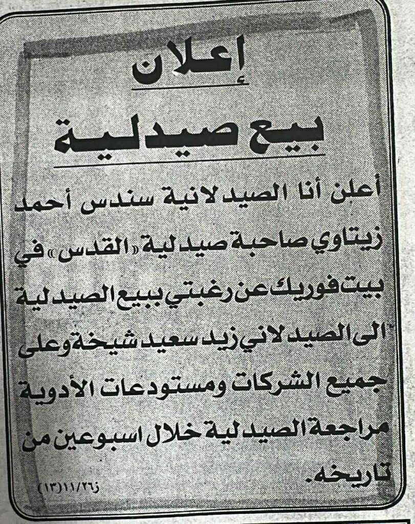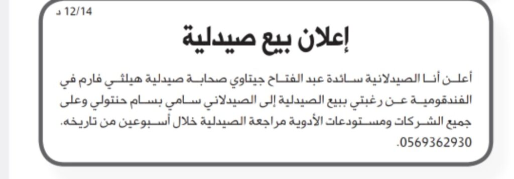 - اعلان بيع صيدلية خليل الرحمن – جوريش
