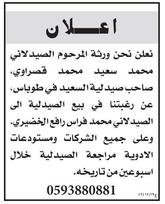 - اعلان بيع صيدلية السعيد /طوباس