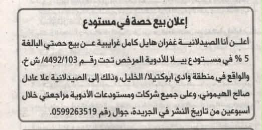 - اعلان بيع حصة في مستوع “بيلا للأدوية”/الخليل