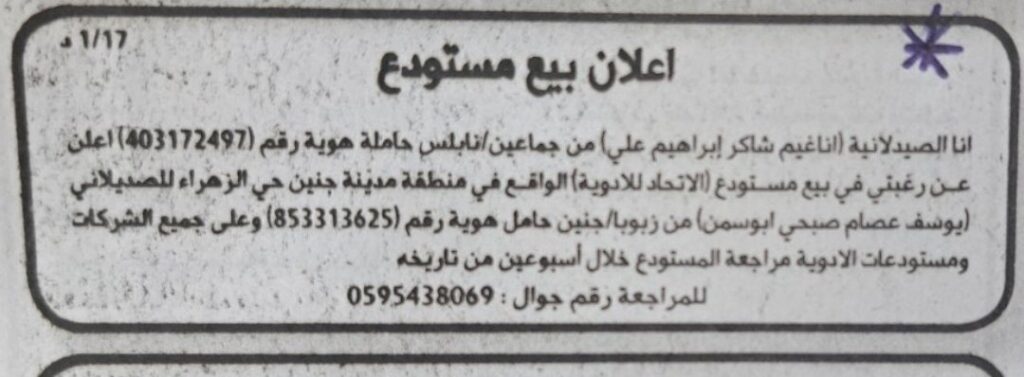 - اعلان بيع صيدلية المغير – جنين