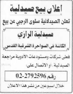 - اعلان بيع صيدلية الرازي /السواحرة الشرقية-القدس